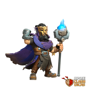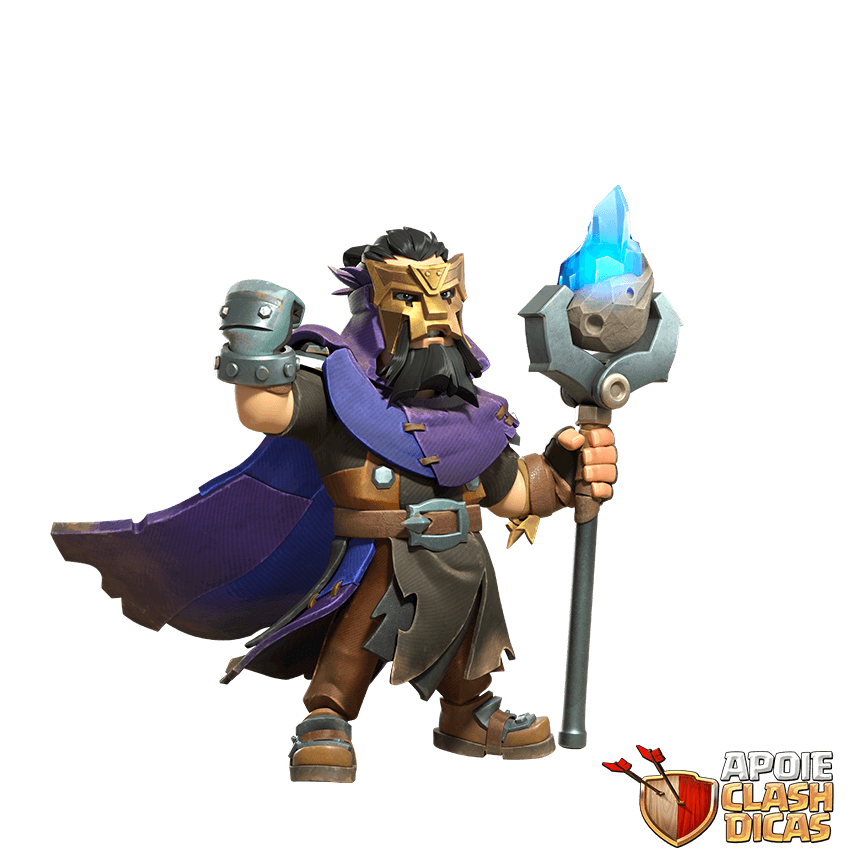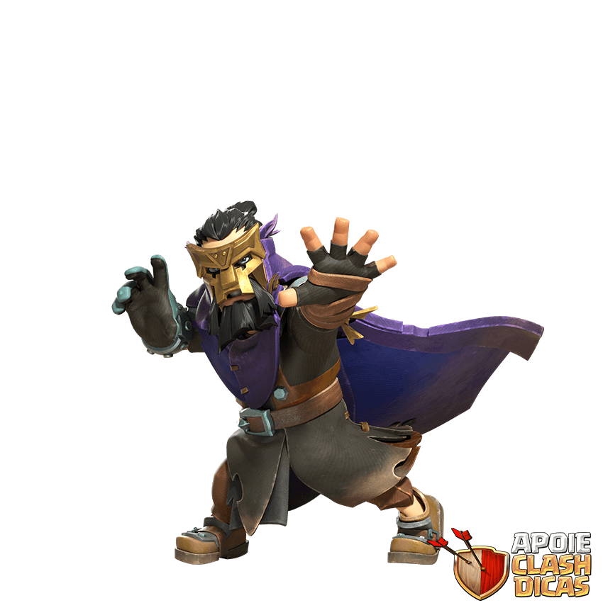 O Grande Guardião se transforma em um místico do deserto, com vestes roxas esvoaçantes e detalhes dourados que remetem a antigos rituais. Seu cajado ganha cristais brilhantes e ornamentos tribais, combinando magia antiga com sobrevivência moderna.