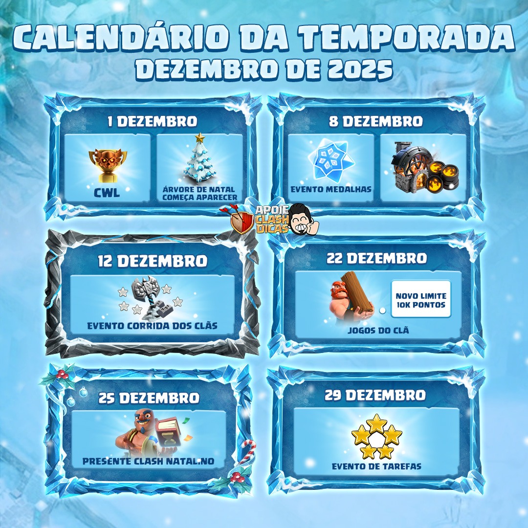 A Temporada Natalina 2025 promete ser cheia de eventos, especialmente após o lançamento do CV18! Com novos limites nos Jogos do Clã, skins e eventos que movimentam os clãs, dezembro vai ser inesquecível! 🎄⚔️✨