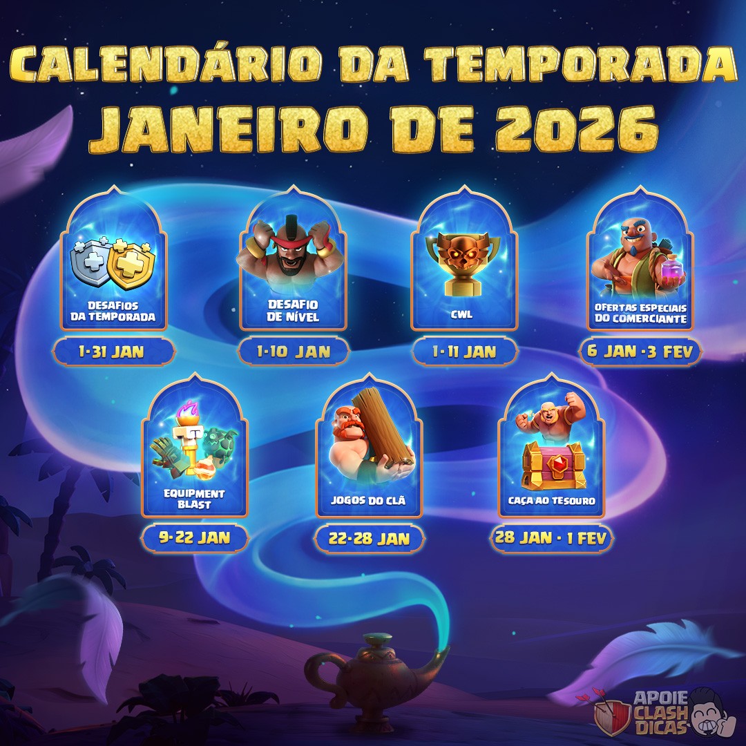 A primeira temporada de 2026 do Clash of Clans está chegando, trazendo uma temática inédita de Noites do Deserto, misturando o folclore árabe/persa das Mil e Uma Noites. “Torne-se uma Lenda das Noites do Deserto” é o lema oficial — forje sua história nas dunas e enfrente eventos extravagantes!
