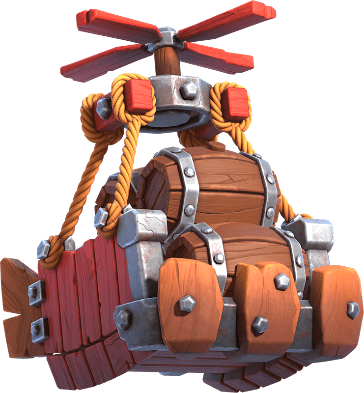 O Aerotáxi lança até 6 barris, cada um contendo uma combinação de tropas do Castelo do Clã junto com: